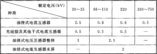范围内tanδ(%)的变化量不应大于0.2。近年注有硅脂、硅油的干式电流互感器使用量大量增加,表10.0.4中的相关限值是根据使用单位现场检测经验提供的。此外,互感器的电容量较小,特别是串级式电压互感器(JCC5-220型和JCC6-110型),连接线、潮气、污秽、接地等因素的影响较大,测试数据分散性较大,宜在晴天、相对湿度小、试品清洁的条件下检测。电压互感器电容量在十几至三十几pF范围,不宜用介损测试仪测量介损,大量实测结果表明:介损测试仪的测量数据与高压电桥的测量数据差异较大。高压电桥的工作原理明确,结构清晰,宜以高压电桥的测量数据为准。尽管现场检测出现的许多问题与试验人员的能力、资质和设备有关,但是有关试验人员的资质、使用设备的必备条件(如设备的检定证书、使用周期、生产许可证等)属于实验室体系管理范畴,不宜纳入交接试验规程之中。