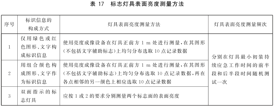 将标志灯具连续充电24h后,按5.5.3.1的要求,对标志灯具(包括照明标志复合灯具)的疏散指示标志进行检查;按5.5.3.2的要求和表17规定的频次和测量方法,对标志灯具(包括照明标志复合灯具)的应急表面亮度进行测量;按5.5.3.3的要求,对地面安装的标志灯具尺寸进行检查;多信息复合标志灯具(包括照明标志复合灯具)应按表17规定的频次和测量方法,分别测量并记录不同疏散指示标志的表面亮度。以上测试结果均满足要求判定为合格。