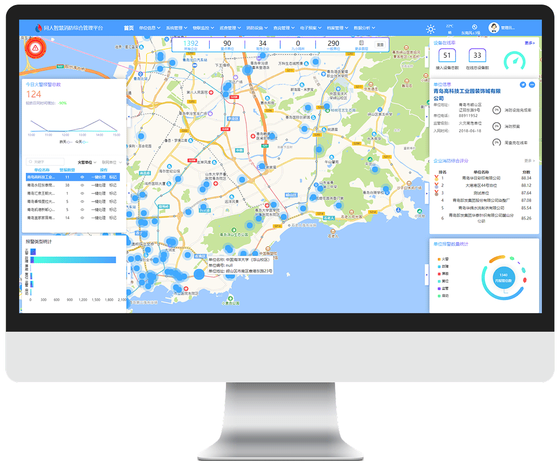 我公司通过对“平台”已注册千余家单位相关数据进行深度挖掘分析,结合多年消防技术服务经验,以促进信息技术与传统消防安全管理深度有效融合为目的而研发的。该系统依据平台的消防物联系统、防火巡查、消防演练、消防维保、检测、评估系统等采集到的实时数据信息,通过智能算法自动计算单位火灾风险防控能力综合评分。